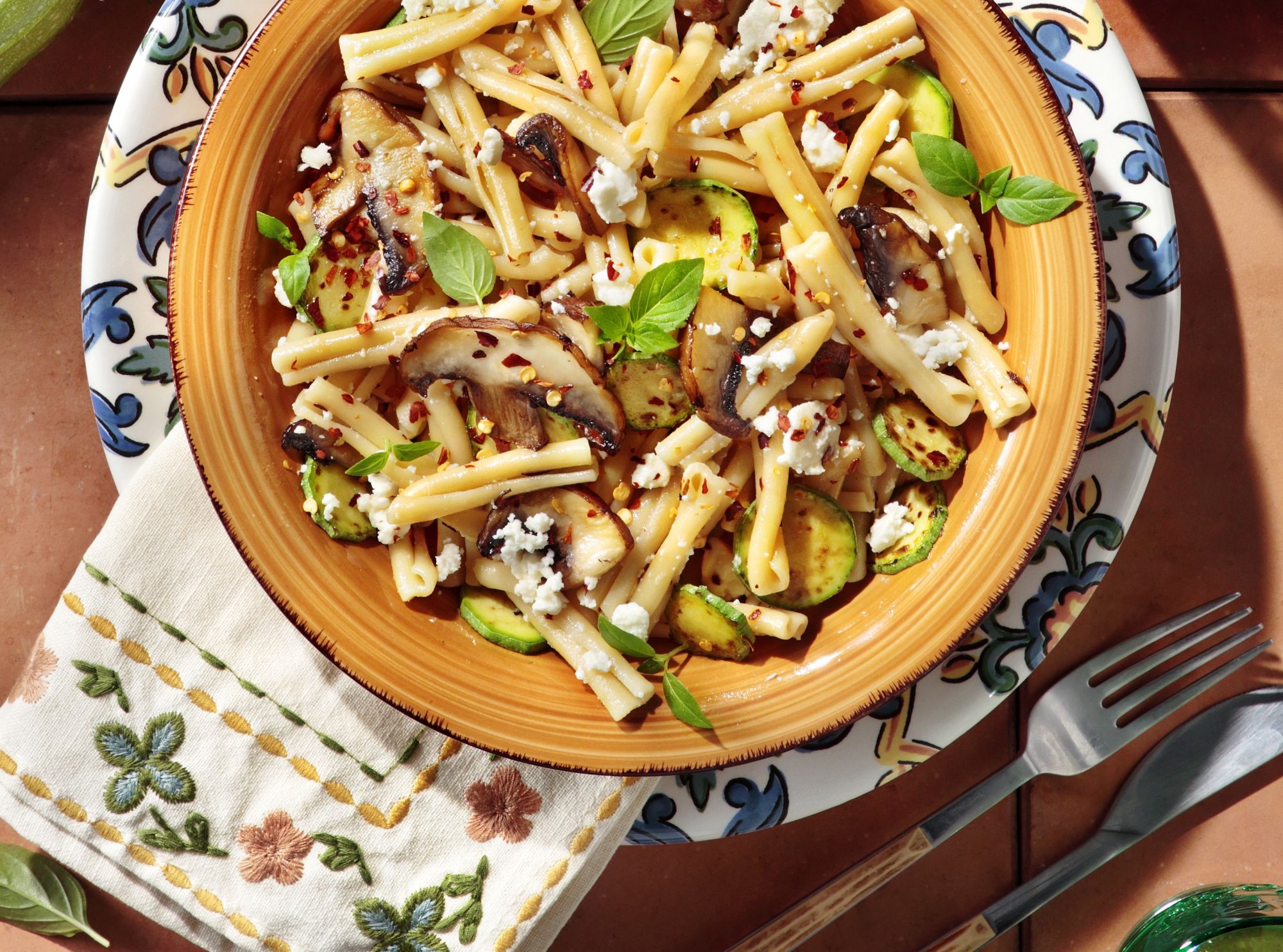 Ζυμαρικά με κολοκυθάκια, ψητά μανιτάρια & φέτα
