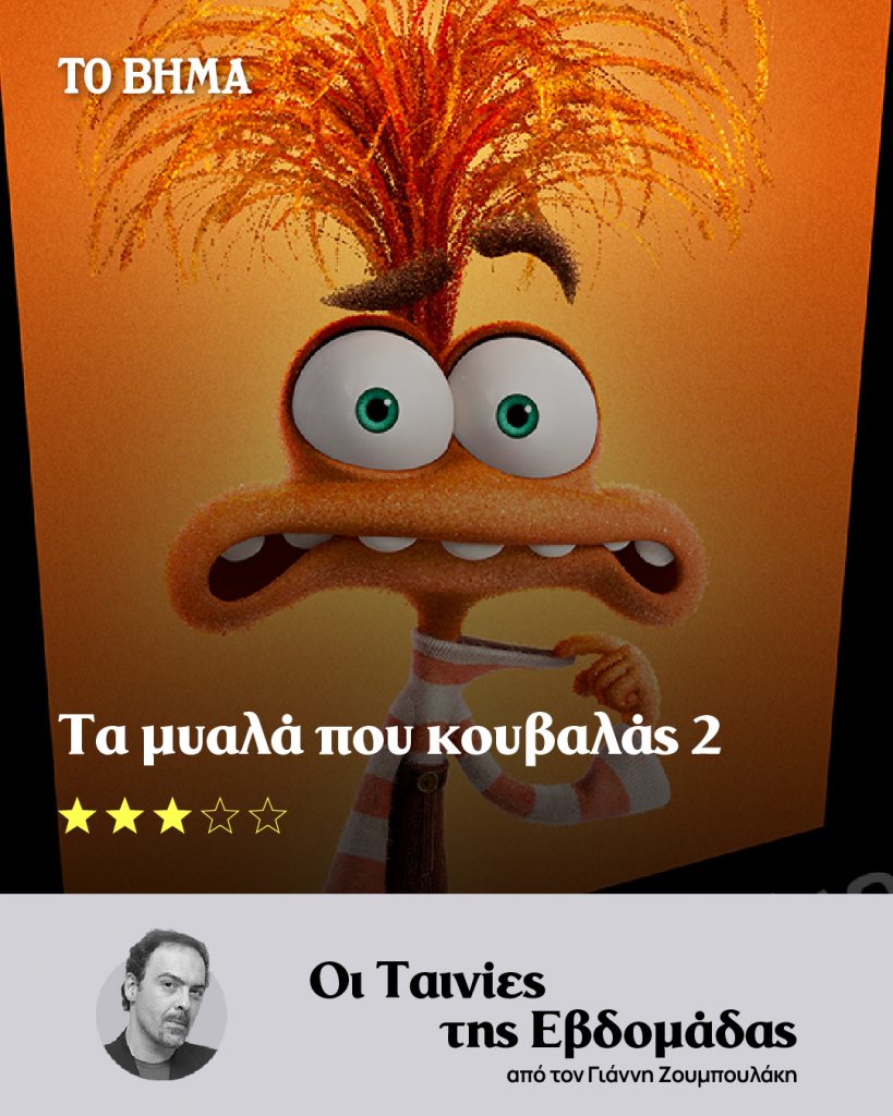 Από τις δύο ταινίες κινουμένων σχεδίων από αυτή την εβδομάδα, το τελευταίο προϊόν της Ντίσνεϊ «Τα μυαλά που κουβαλάς 2» (Inside out 2, ΗΠΑ, 2024) του Κέλσεϊ Μαν ξεχωρίζει με άνεση. Δυναμική επιστροφή στον δημοφιλή μύθο του «Τα μυαλά που κουβαλάς» που υπήρξε μια από τις μεγάλες επιτυχίες της χρονιάς του (2015) και έφτασε ως τα Οσκαρ κερδίζοντας το καλύτερης ταινίας κινουμένων σχεδίων. Το θαυμάσιο εύρημά της πρώτης ταινίας ήταν να αποδοθούν σε animation τα συναισθήματα ενός κοριτσιού, της Ράιλι. Από τον θάλαμο επιχειρήσεων της ψυχής της, η Χαρά, ο Θυμός, ο Φόβος, η Λύπη και Αηδία πλοηγούσαν τον συναισθηματικό κόσμο της.