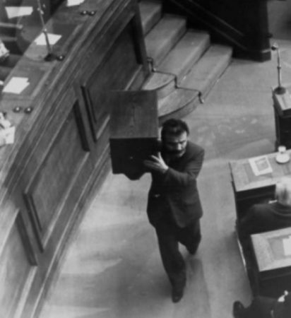 Και τότε, εν μέσω έντονων αντιδράσεων, ο Λευτέρης Καλογιάννης άρπαξε την κάλπη, την έβαλε στον ώμο του και έφυγε από την αίθουσα της Ολομέλειας.