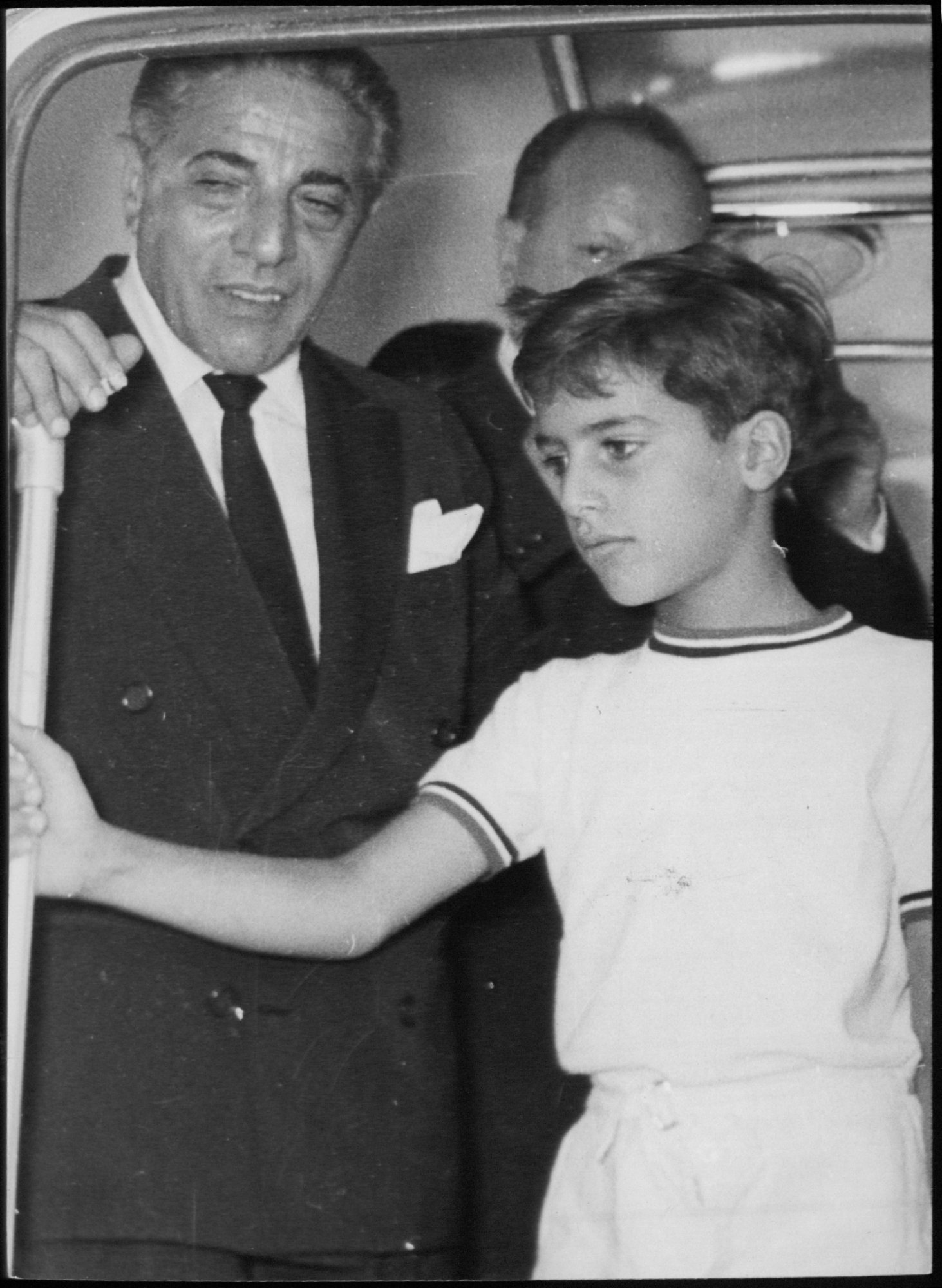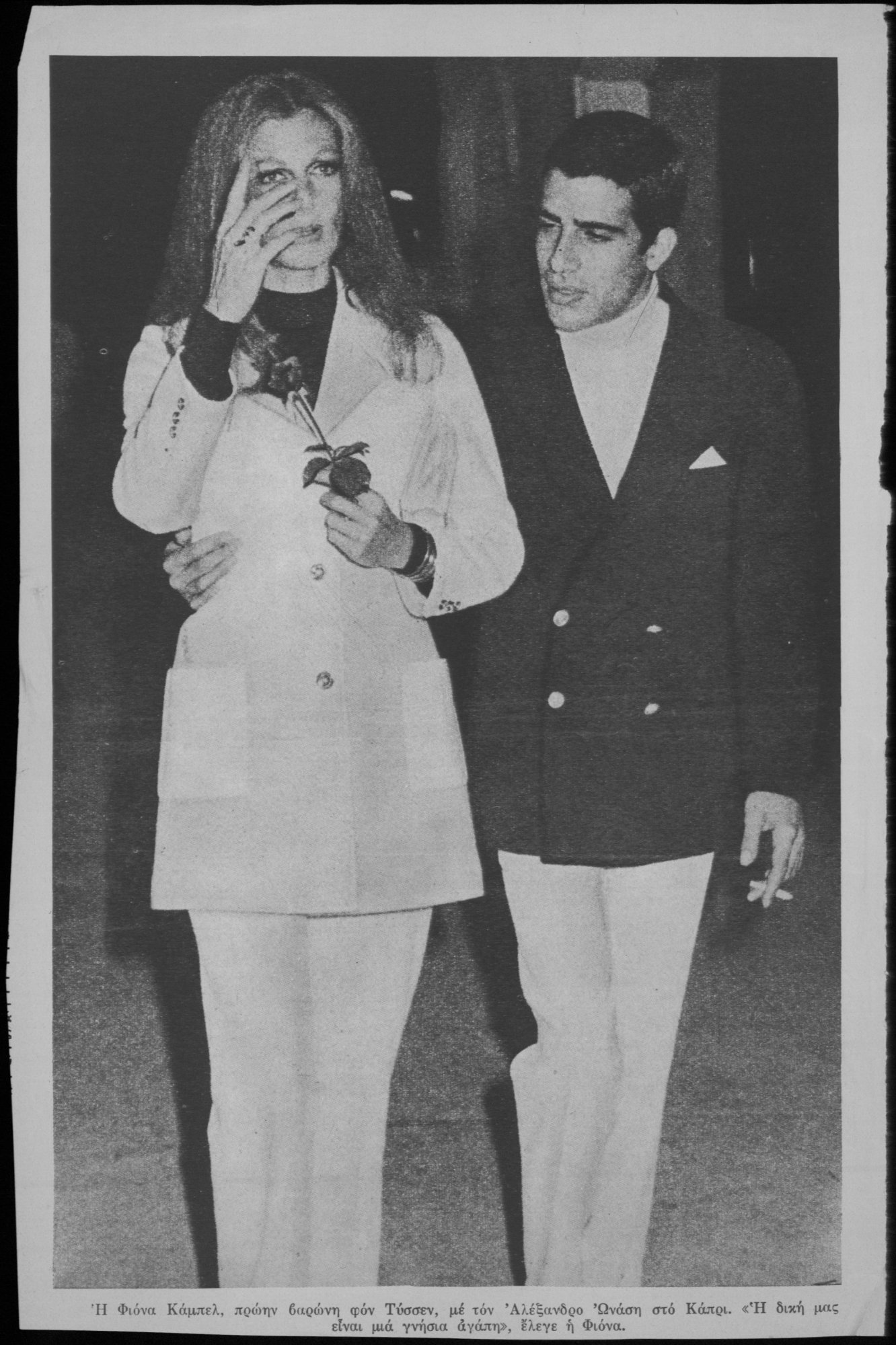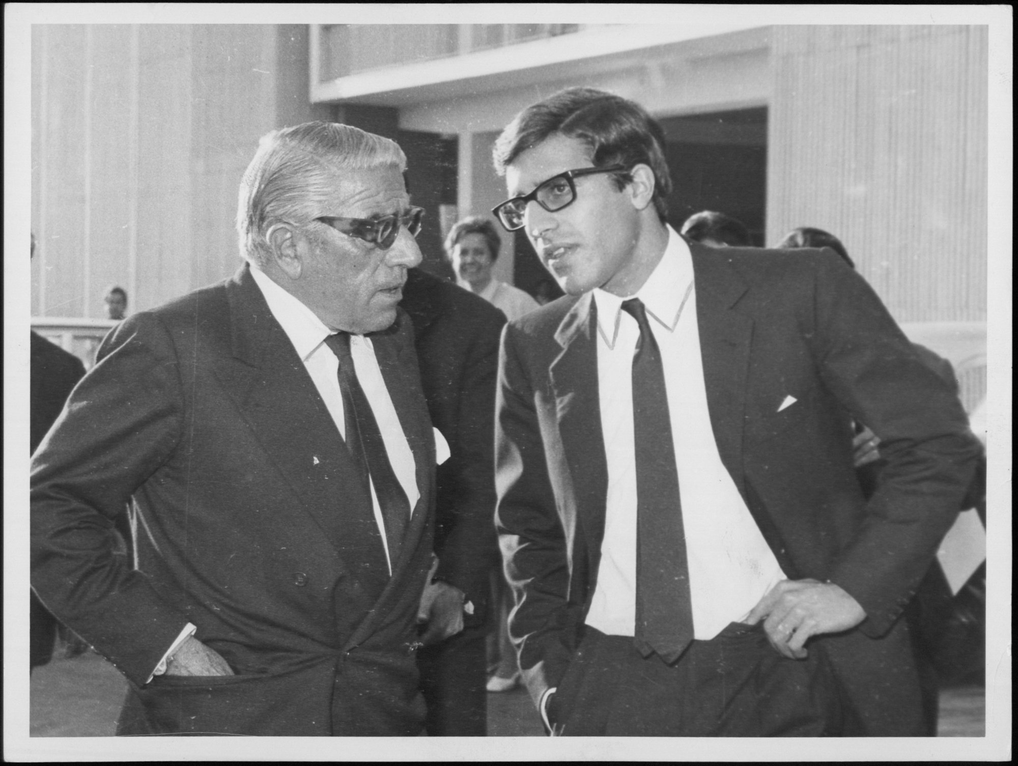 Ο Ωνάσης φοράει μαύρο κοστούμι και μαύρη γραβάτα. Σαστισμένοι οι φωτογράφοι σηκώνουν τις κάμερες. Τον βλέπουν για πρώτη φορά δακρυσμένο.