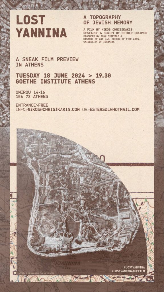 Εχοντας προσφάτως ολοκληρωθεί, η ταινία τεκμηρίωσης «Lost Yannina”: A Topography of Jewish Memory», πραγματοποιεί την Τρίτη 18 Ιουνίου την αθηναϊκή πρεμιέρα της που θα γίνει στις 19.30 στο Ινστιτούτο Γκαίτε (Ομήρου 14-16).