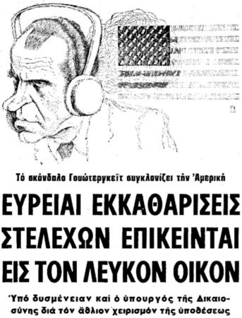 «Το σκάνδαλο του Γουότεργκεϊτ εξελισσόταν ενώ στην Ελλάδα υπήρχε ακόμη η χούντα αλλά το ενδιαφέρον ήταν τεράστιο και “Το Βήμα” δημοσίευε αρκετά προβεβλημένες τις σχετικές ανταποκρίσεις μου. Τις έστελνα τηλεφωνικά, γνωρίζοντας και εγώ και ο συνάδελφος κ. Τσαπραλής, που ήταν στο άλλο άκρο της γραμμής, ότι μας παρακολουθούν. Ακριβώς την ημέρα που μετέδιδα για τον Νίξον που ήθελε να συγκαλύψει το σκάνδαλο ακούω μια τρίτη φωνή “βρε τον π…”. Δεν μπόρεσε να κρατήσει την έκπληξη (ή οργή) ο ωτακουστής μας. Και άλλες φορές έκαναν αισθητή, σκόπιμα νομίζω, την παρουσία τους οι “παρατηρητές”.