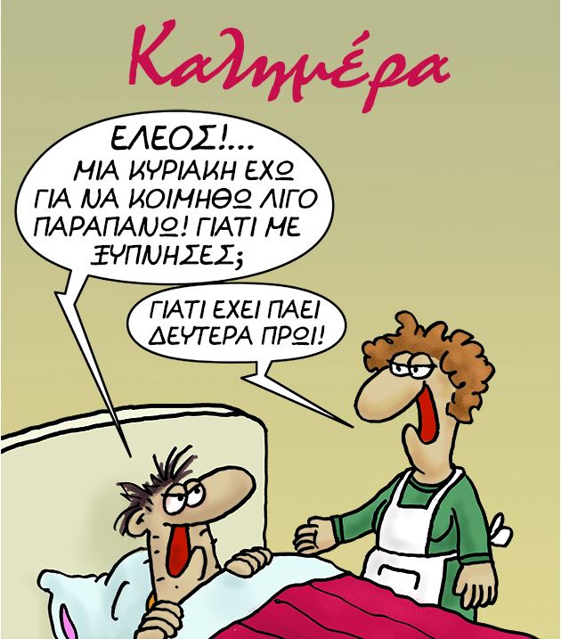 – Ελεος!… Μια Κυριακή έχω για να κοιμηθώ λίγο παραπάνω. Γιατί με ξύπνησες;