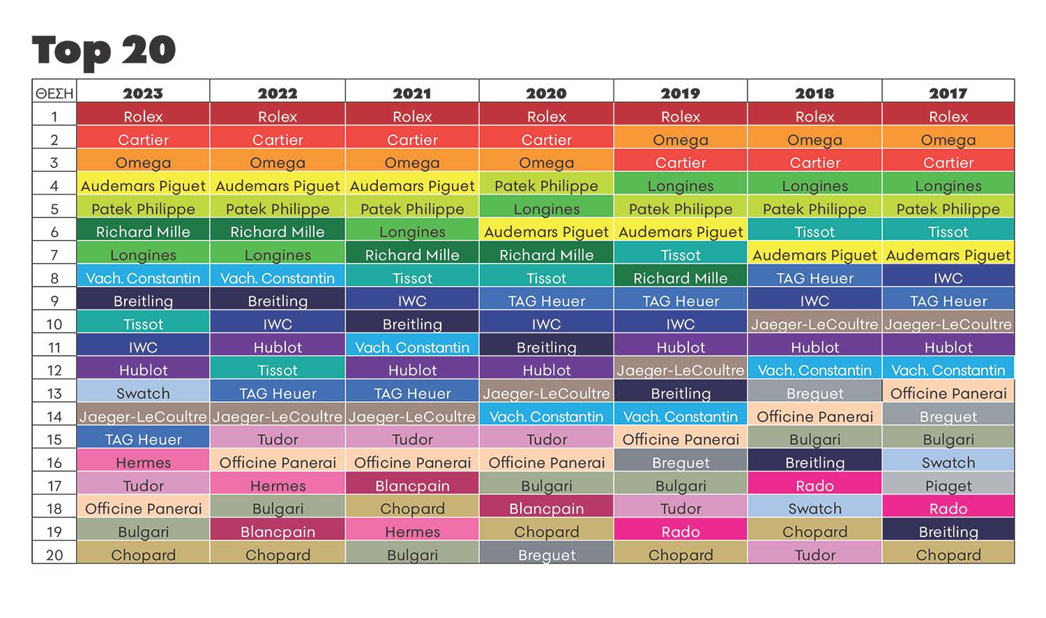 Με βάση τα στοιχεία υπήρξαν εκπλήξεις. Για παράδειγμα η Swatch μπήκε στο top 20 για πρώτη φορά προφανώς χάρη στην τεράστια επιτυχία του MoonSwatch (πούλησε 5,8 εκατομμύρια ρολόγια πέρυσι) ενώ η Blancpain έπεσε κάτω από το top 20, παρά την 70ή επέτειο του Fifty Fathoms και το αντίστοιχο Scuba Fifty Fathoms με την Swatch. Οι άλλες μάρκες που ξεπέρασαν το φράγμα του ενός εκατομμυρίου σε πωλήσεις ρολογιών είναι η Tissot με 3,1, η Longines με 1,6 και η Rolex με 1,24 εκατομμύρια ρολόγια.
