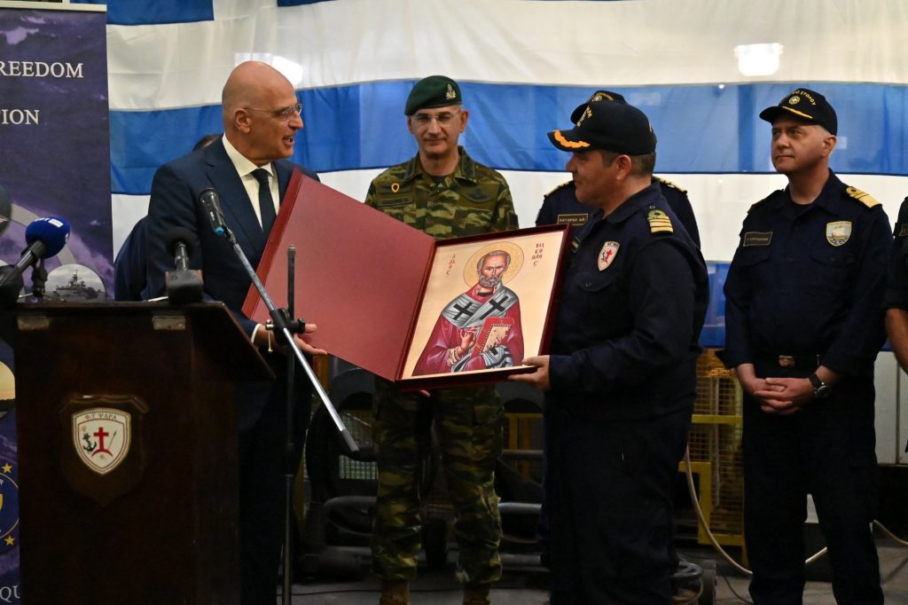 Ολοκληρώνοντας την επίσκεψή του στη φρεγάτα «Ψαρά», ο κ. Δένδιας δώρισε στον κυβερνήτη το εικόνισμα του προστάτη του Πολεμικού Ναυτικού, του Αγίου Νικολάου και ευχήθηκε προς το πλήρωμα «καλή επιτυχία» στην αποστολή του.