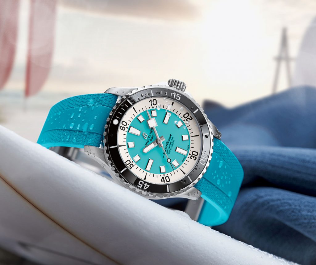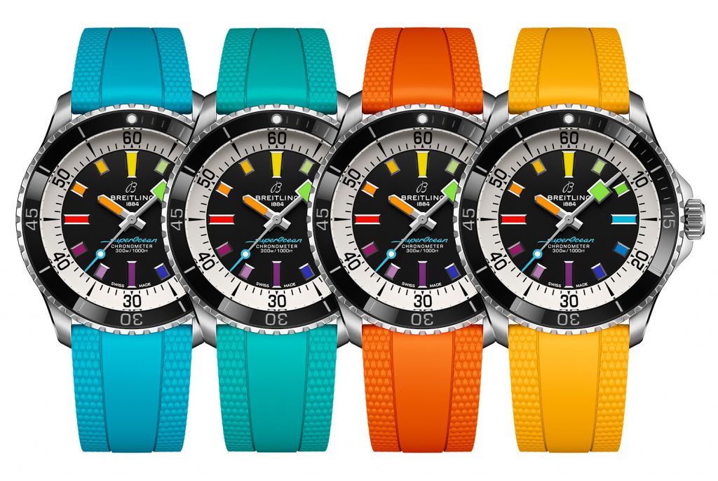 Λίγο πριν από την επίσημη έναρξη του καλοκαιριού, η Breitling παρουσίασε μία πολύχρωμη σειρά μοντέλων Superocean. Έχουν καντράν με δείκτες ώρας στα χρώματα ουράνιου τόξου που φέρουν μάλιστα και επίστρωση Super-LumiNova® σε κίτρινο, πράσινο, μπλε, ινδικό μπλε, βιολετί, κόκκινο και πορτοκαλί Τα μοντέλα Superocean Rainbow διατίθενται σε τέσσερις εκδόσεις 42 mm με λουράκια από καουτσούκ σε τιρκουάζ, γαλαζοπράσινο, πορτοκαλί και κίτρινο, καθώς και σε μια θηλυκή έκδοση 36 mm με κάσα από ατσάλι και κόκκινο χρυσό 18Κ.
