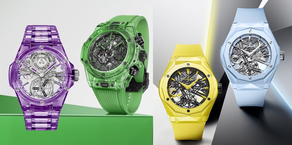 Η Hublot έβαλε πολύ χρώμα στα κεραμικά υψηλής τεχνολογίας αλλά ακόμη και στα κρύσταλλα ζαφειριού με τα οποία κατασκεύασε τις κάσες των ρολογιών της.