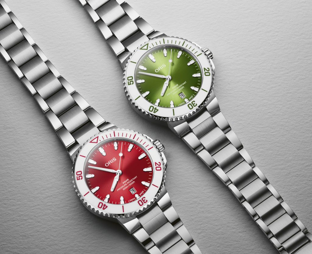 Φέτος παρουσιάζει δύο συλλεκτικές εκδόσεις του Aquis Date 41,50mm με καντράν στα χρώματα του καρπουζιού –κόκκινο και έντονο πράσινο– και κεραμικές λευκές στεφάνες. Ό,τι πρέπει για εξορμήσεις στη θάλασσα.