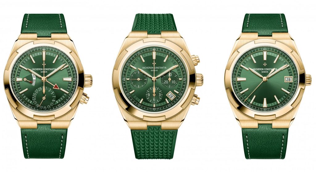 Μία πολύ ωραία «πληθωρική» απόχρωση του πράσινου επέλεξε η Vacheron Constantin για τα καντράν και τα λουράκια τεσσάρων νέων μοντέλων Overseas από ροζ χρυσό 18Κ. Είναι τα Overseas Dual Time και Self-Winding με διάμετρο κάσας 41 mm, το Overseas Chronograph 42.5mm και το Overseas Self-Winding 35mm με διαμάντια στη στεφάνη.