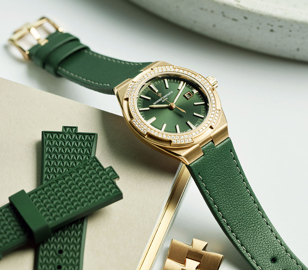 Φορούν μπρασελέ από ροζ χρυσό αλλά χάρη στο σύστημα εύκολης αλλαγής της VC συνοδεύονται και από δύο λουράκια –πράσινα βεβαίως– από λείο δέρμα και από ανάγλυφο καουτσούκ.