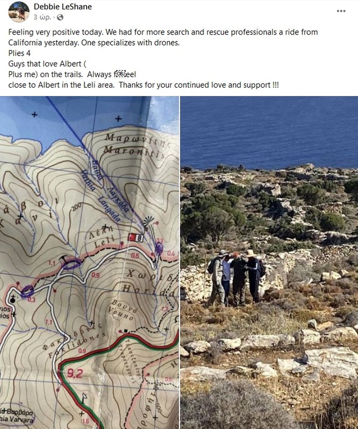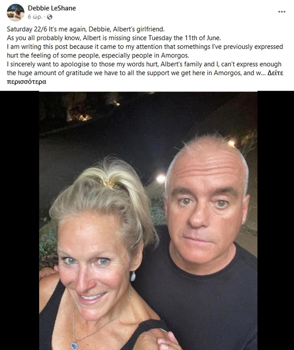 Η σύντροφός του Debbie Leshane σε ανάρτησή της σε ομάδα της Αμοργού στο Facebook είπε ότι οι έρευνες για τον 59χρονο σύντροφό της συνεχίζονται.
