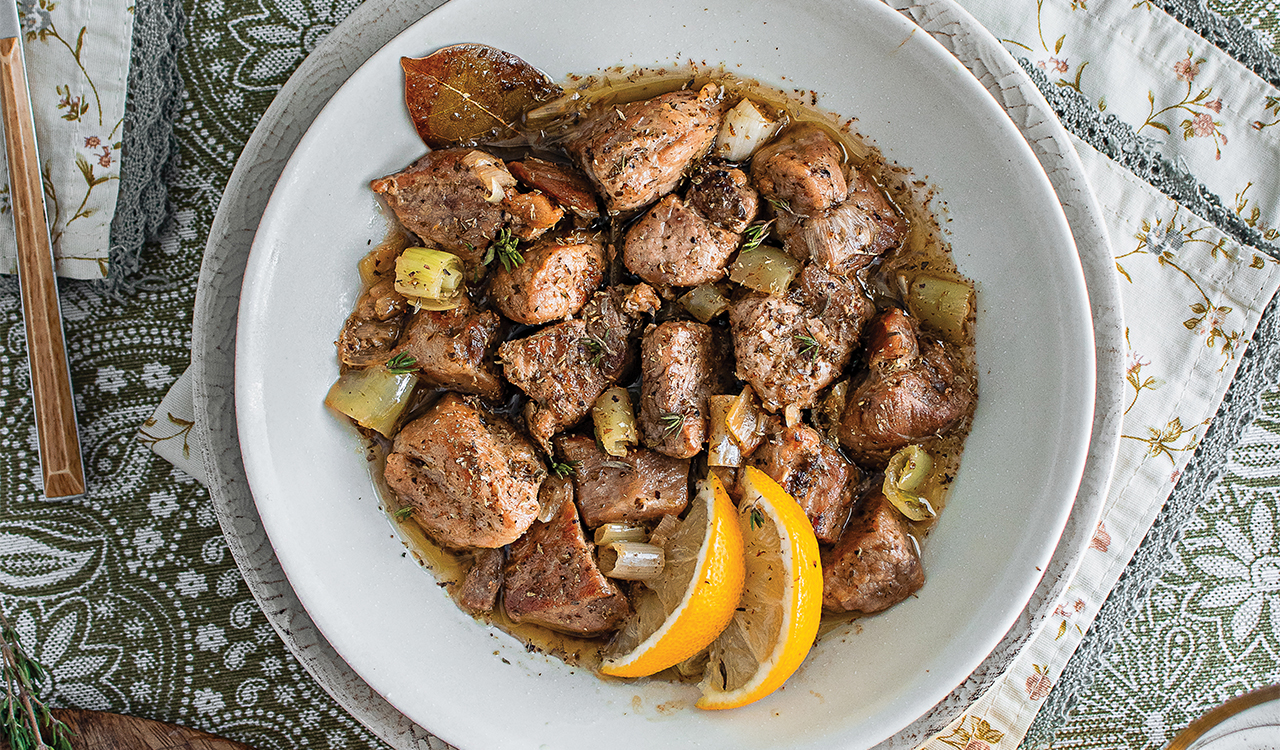 Γρήγορη χοιρινή τηγανιά με καυτερή πιπεριά, θυμάρι και μοσχάτο Σάμου