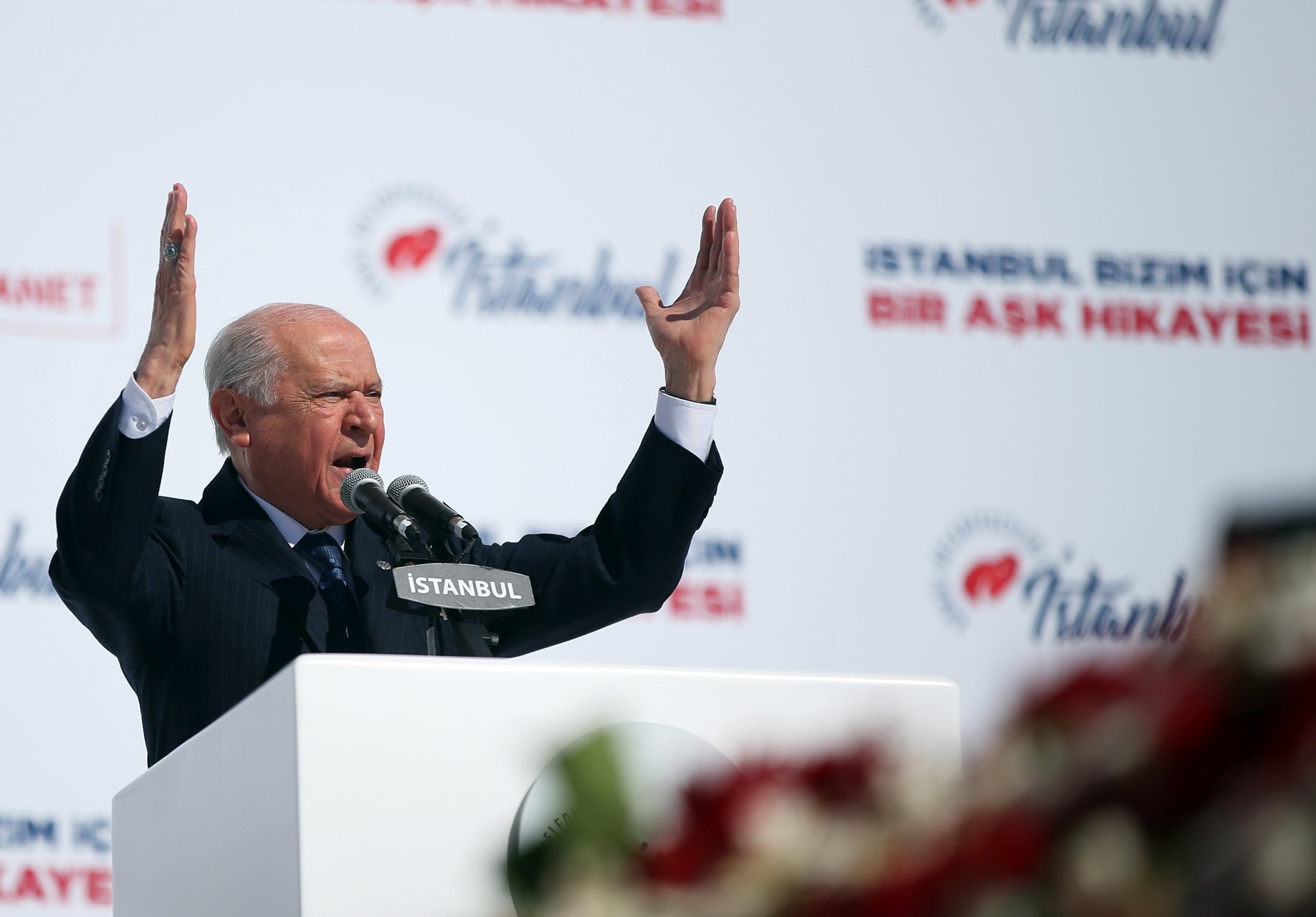 Επιπλέον τόνισε πώς «η δική μας γραμμή είναι η γραμμή που χάραξε ο Μουσταφά Κεμάλ Ατατούρκ, ο οποίος κρέμασε σαν μετάλλιο στον λαιμό της ιστορίας τις λέξεις: «Η μόνη μου τιμή και ο μόνος μου πλούτος στη ζωή δεν είναι τίποτε άλλο παρά ο τουρκισμός»