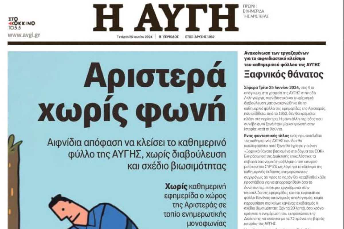 Σήμερα Τρίτη 25 Ιουνίου 2024 στις 4 το απόγευμα στα γραφεία της Αυγής στην οδό Δεληγιώργη, αιφνιδιαστικά και χωρίς καμιά διαβούλευση, μας ανακοινώθηκε ότι το καθημερινό φύλλο της εφημερίδας της Αριστεράς που εκδίδεται από το 1952 δεν θα κρεμιέται πλέον στα περίπτερα. Η μόνη άλλη περίοδος που συνέβη αυτό ξανά ήταν μία και γνωστή στην ιστορία: στη χούντα.