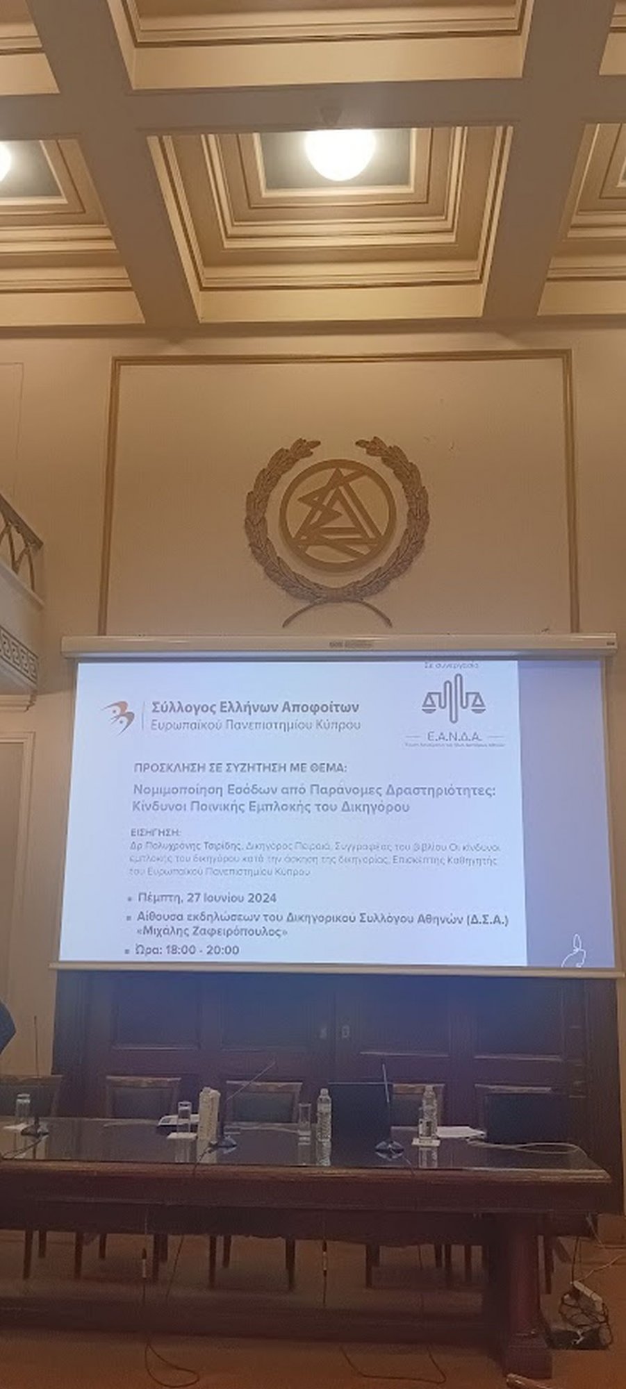 «Νομιμοποίηση εσόδων από παράνομες δραστηριότητες: Κίνδυνοι Ποινικής Εμπλοκής του Δικηγόρου». Αυτό ήταν το θέμα που συζήτησαν χθες νομικοί και εκπρόσωποι της ακαδημαϊκής κοινότητας της Ελλάδας και της Κύπρου σε μια άκρως ενδιαφέρουσα εκδήλωση που διοργάνωσε ο Σύλλογος Ελλήνων Αποφοίτων Ευρωπαϊκού Πανεπιστημίου Κύπρου σε συνεργασία με την Ένωση Ασκουμένων και Νέων Δικηγόρων Αθηνών (Ε.Α.Ν.Δ.Α.).