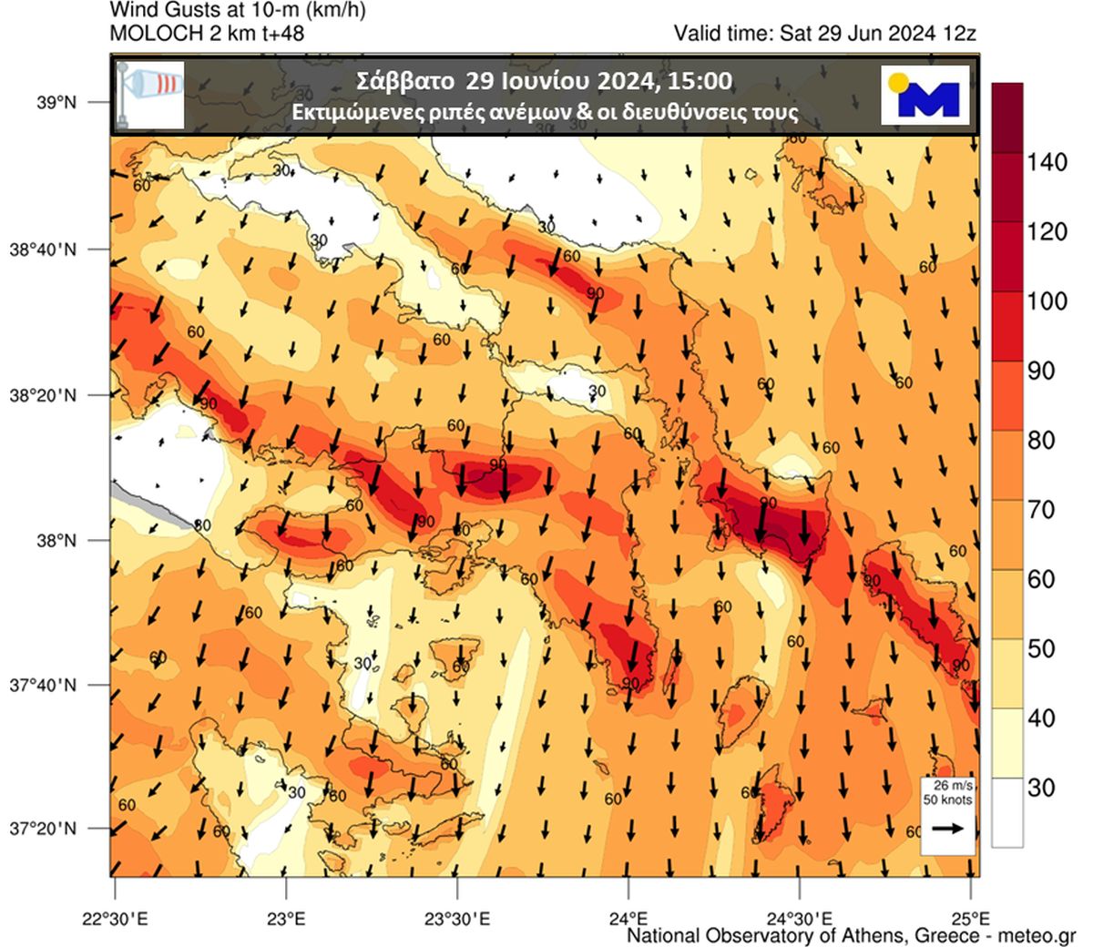 Οι εκτιμώμενες μέγιστες ριπές των ανέμων (πορτοκαλί αποχρώσεις) και οι διευθύνσεις τους (μαύρα βελάκια) για τις μεσημεριανές ώρες του Σαββάτου 29/06, όπως υπολογίζεται από το υψηλής ανάλυσης αριθμητικό μοντέλο πρόγνωσης καιρού του Εθνικού Αστεροσκοπείου Αθηνών / Meteo.gr.