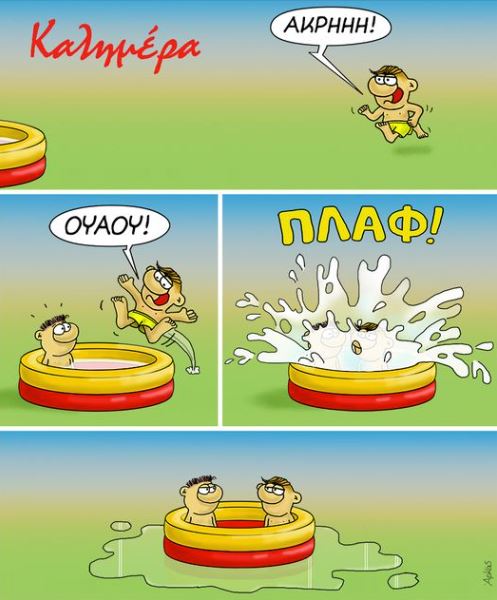 Με τον μικρό Θανασάκη που αναζητά λίγη δροσιά μάς καλημερίζει σήμερα ο Αρκάς. Ο μικρός ήρωας του Αρκά στην προσπάθειά του να δροσιστεί μάλλον δεν τα καταφέρνει ιδιαίτερα καλά καθώς, από τη λαχτάρα και τη χαρά του φέρνει το αντίθετο αποτέλεσμα από αυτό που επιδίωκε.