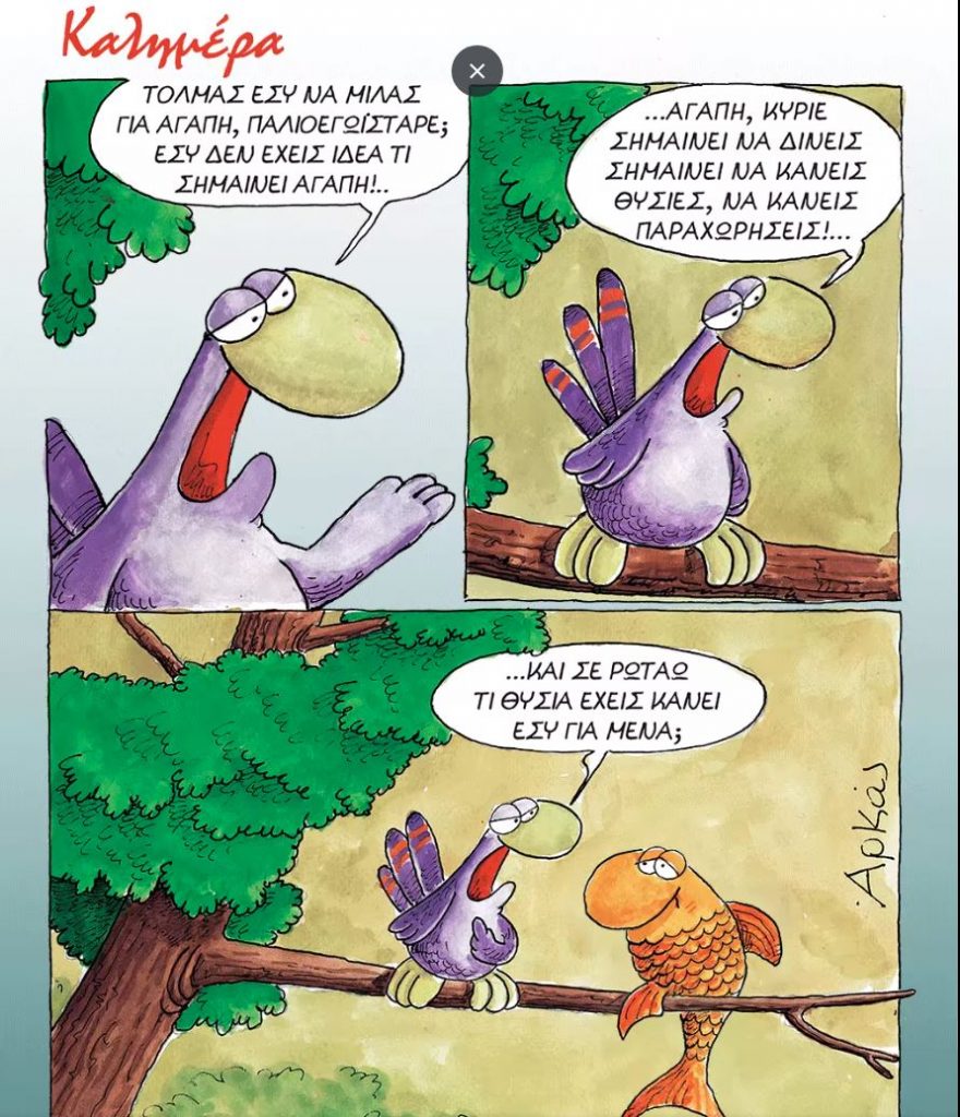 Ετσι στα καρέ του σημερινού του σκίτσου τοποθετεί το πουλί που παραπονιέται στο σύντροφό του και να τον αποκαλεί «παλιοεγωιστή» ενώ επιπλέον τον κατηγορεί ότι δεν ξέρει τι σημαίνει θυσία και δεν έχει κάνει καμία θυσία για αυτόν.