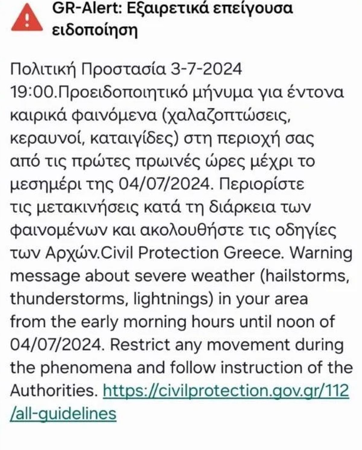 Το μήνυμα της Πολιτικής Προστασίας συνιστά στους πολίτες να περιορίσουν τις μετακινήσεις τους κατά τη διάρκεια των φαινομένων και να ακολουθούν τις οδηγίες των Αρχών. Η προειδοποίηση αφορά επιδείνωση των καιρικών φαινομένων από τις πρώτες πρωινές ώρες μέχρι το μεσημέρι της Πέμπτης (4/7).