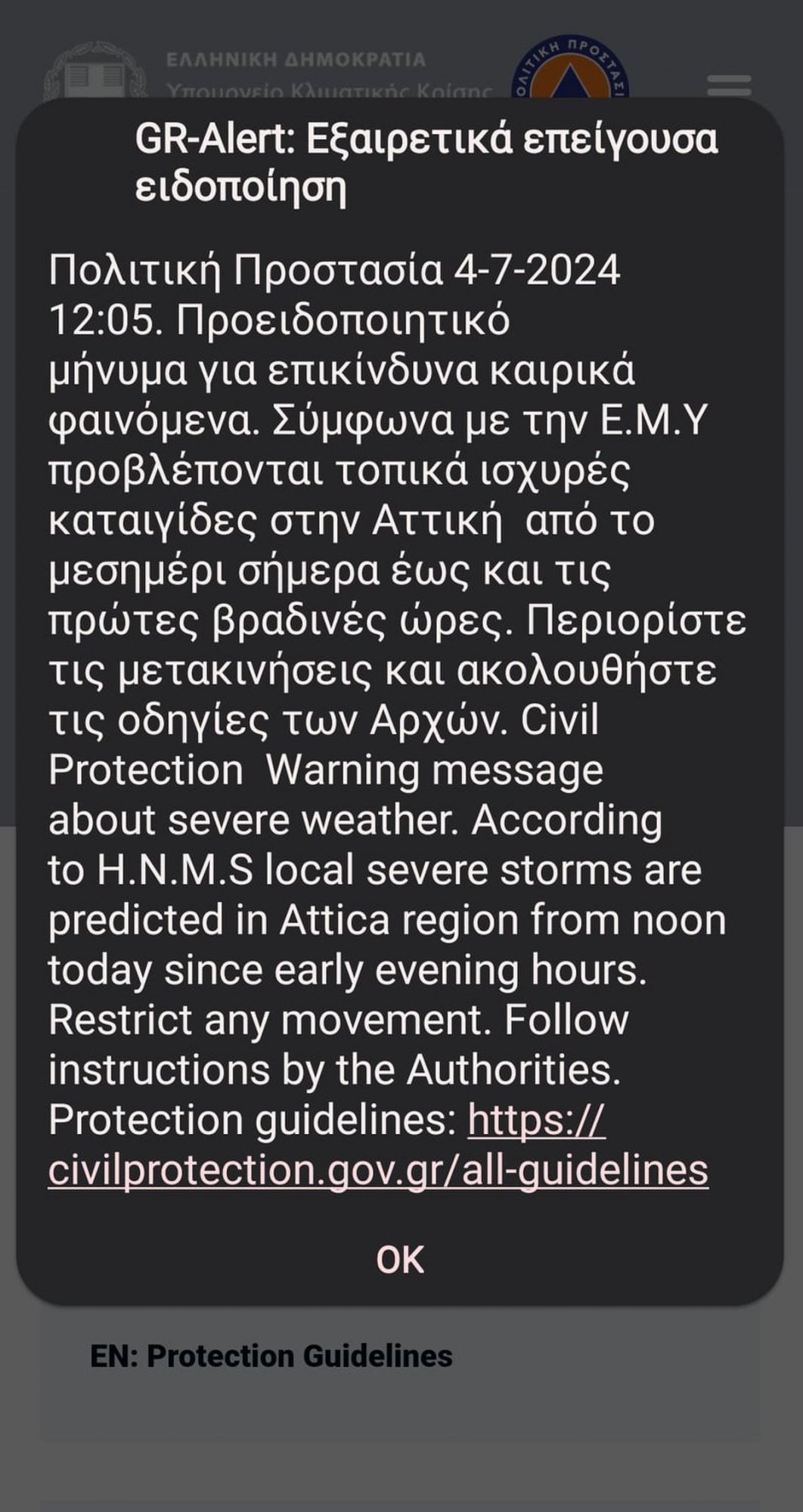 Η Γενική Γραμματεία Πολιτικής Προστασίας έστειλε μήνυμα του 112, προειδοποιώντας για επικίνδυνα καιρικά φαινόμενα. «Σύμφωνα με την ΕΜΥ προβλέπονται τοπικά ισχυρές καταιγίδες στην Αττική από το μεσημέρι σήμερα έως και τις πρώτες βραδινές ώρες. Περιορίστε τις μετακινήσεις σας και ακολουθήστε τις οδηγίες των Αρχών» ανέφερε.