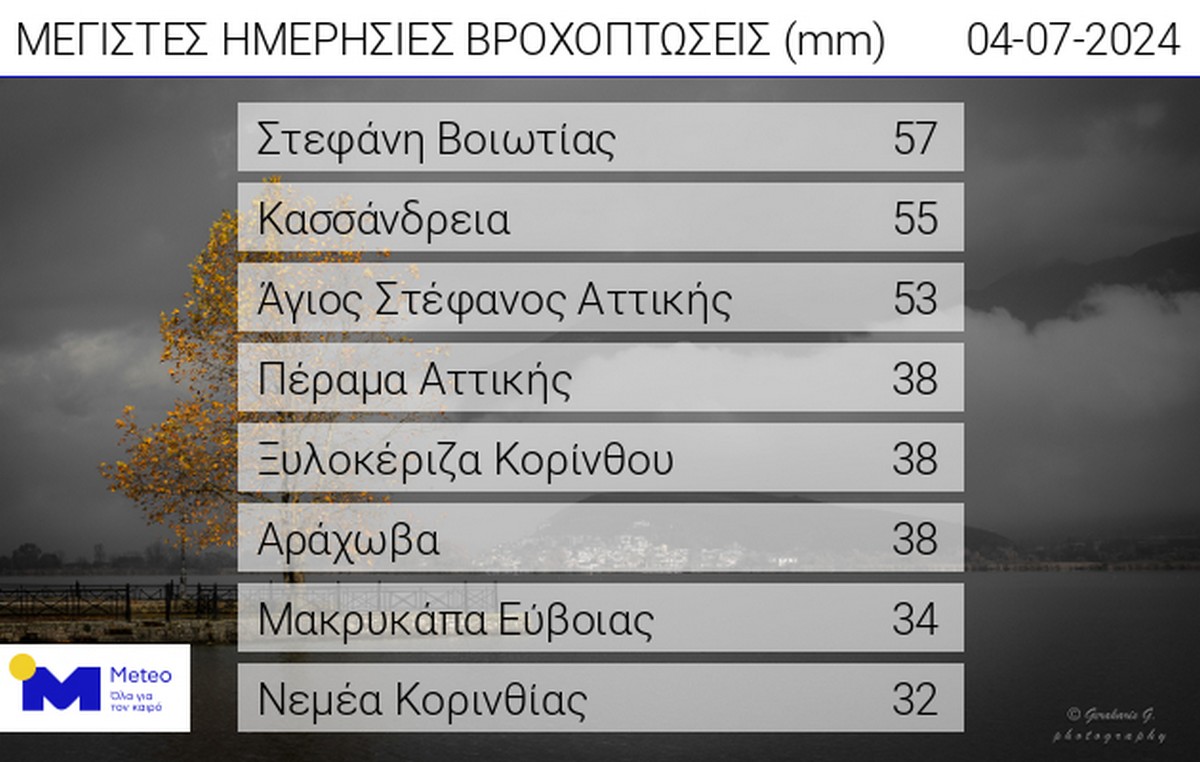Η κακοκαιρία που χτυπά από την Τετάρτη τη χώρας μας έφερε πολλές βροχές, καταιγίδες, χιλιάδες κεραυνούς, χαλάζι και φωτιές σε πολλά μέρη της Ελλάδας. Το δίκτυο αυτόματων μετεωρολογικών σταθμών του meteo.gr / Εθνικού Αστεροσκοπείου Αθηνών κατέγραψε τη μεγαλύτερη ποσότητα νερού στη Στεφάνη Βοιωτίας (57 χιλοστά).