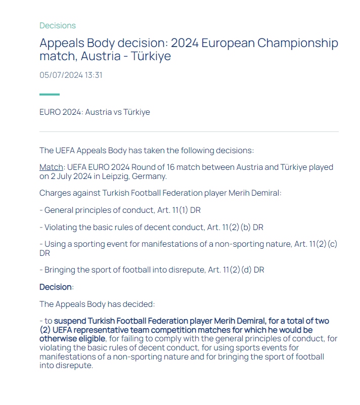 Το μεσημέρι της Παρασκευής η UEFA επιβεβαίωσε τις πληροφορίες που κυκλοφορούσαν ήδη στον διεθνή Τύπο. Εξετάζοντας τη χειρονομία του Ντεμιράλ με βάση το άρθρο 11 του Πειθαρχικού Κώδικα, η αρμόδια επιτροπή τον τιμώρησε για παραβίαση των κανόνων αξιοπρεπούς συμπεριφοράς, πανηγυρισμό μη αθλητικού περιεχομένου και δυσφήμηση του ποδοσφαίρου.