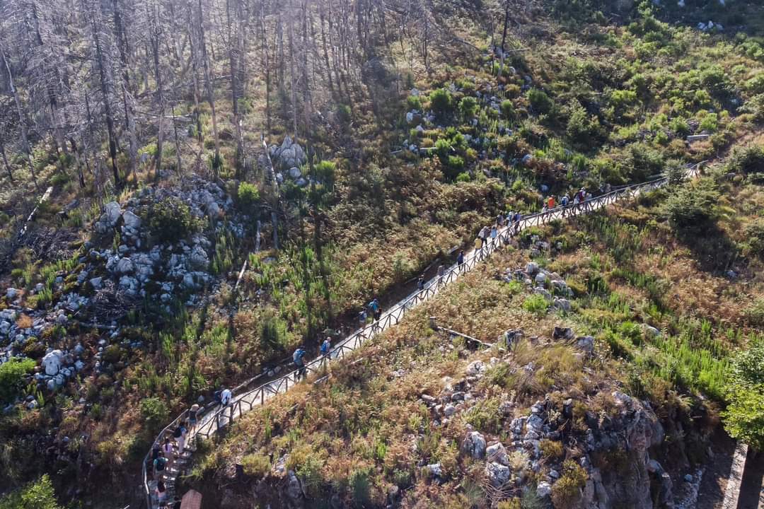 Βάλαμε καπέλο, αντηλιακό, πήραμε παγούρι και ένα μικρό σακίδιο και ακολουθήσαμε το μονοπάτι στην κορυφή του βουνού σε υψόμετρο περίπου 1000 μέτρων, προκειμένου να διαπιστώσουμε από κοντά πώς συμπεριφέρθηκε η βλάστηση μετά τη φωτιά. Εδώ που – προς μεγάλη μας έκπληξη και (ανακούφιση ταυτόχρονα) – συναντιούνται διαφορετικά είδη δένδρων και το ένα συμπληρώνει ή ευφυώς (σύμφωνα με τη φύση) αντιμάχεται το άλλο.