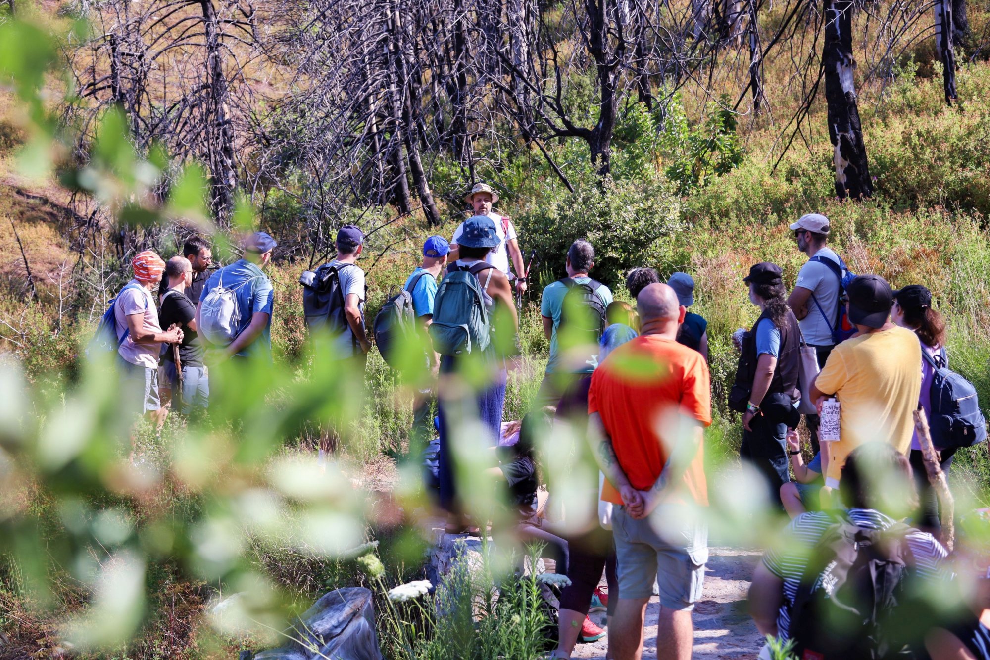 Κατά τη διάρκεια της πεζοπορίας μας, σε στάσεις για ξεκούραση σε διάφορα σημεία, ανάμεσα σε γεφυράκια και κιόσκια, μάθαμε τις διάφορες προσεγγίσεις αναδάσωσης, φυσικής και τεχνητής του συγκεκριμένου δάσους. Είδαμε από κοντά πως στην περίπτωση της μαύρης πεύκης που καίγεται δύσκολα αλλά που δεν αναγεννιέται από μόνη της μετά τη φωτιά, η φύση κάνει τη δουλειά της, παράγοντας βελανιδιές στη θέση της – τα δέντρα που, ανταγωνιστικά απέναντι στη μαύρη πεύκη, παίρνουν την εκδίκησή τους αναγεννημένα από την πυρκαγιά. Ας μην ξεχνάμε πως στη Βόρεια Εύβοια φυτρώνει το μοναδικό ενδημικό υποείδος βελανιδιάς, η ευβοϊκή βελανιδιά.