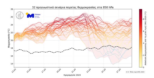 Όλα σχεδόν τα σενάρια συμφωνούν σε ακραία θετικές αποκλίσεις τιμών θερμοκρασίας από τη μέση κλιματική τιμή της περιόδου 1991-2020. Χαρακτηριστικό των επόμενων ημερών θα είναι ότι η μέγιστη ημερήσια τιμή της θερμοκρασίας θα ξεπερνά καθημερινά τους 38-40 °C σε πολλές περιοχές της χώρας μας, φτάνοντας σε επίπεδα 8-10 °C πάνω από τις κανονικές για την εποχή τιμές. Παράλληλα, οι ελάχιστες τιμές θερμοκρασίας νωρίς το πρωί στα περισσότερα αστικά κέντρα δεν θα υποχωρούν κάτω από τους 28-29 °C.