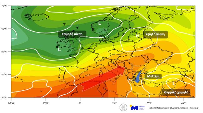 Αιτία αυτού του παρατεταμένου διαστήματος υψηλών θερμοκρασιών είναι η εμμονή της διάταξης των βαρομετρικών συστημάτων που δείχνει ο παρακάτω χάρτης. Αλλεπάλληλα βαρομετρικά χαμηλά (L στον χάρτη) στη Δυτική Ευρώπη έχουν εδραιώσει μια συνεχή ροή θερμών αερίων μαζών από τη Βόρεια Αφρική προς την Ανατολική Ευρώπη (κόκκινο βέλος). Επίσης, η παρουσία υψηλών πιέσεων στη Βόρεια και Κεντρική Ευρώπη (H στον χάρτη) προκαλεί επιπλέον θέρμανση των αερίων μαζών και εμποδίζει τα βαρομετρικά χαμηλά της Δυτικής Ευρώπης να επηρεάσουν τα Βαλκάνια. Στη χώρα μας, γι’ αυτόν τον λόγο θα απουσιάσουν οι αξιόλογες βροχοπτώσεις, ενώ το μελτέμι θα ενισχυθεί στο Αιγαίο λόγω του συνδυασμού των υψηλών πιέσεων στην Κεντρική Ευρώπη και στις χαμηλές πιέσεις του θερμικού βαρομετρικού χαμηλού στη Μέση Ανατολή.