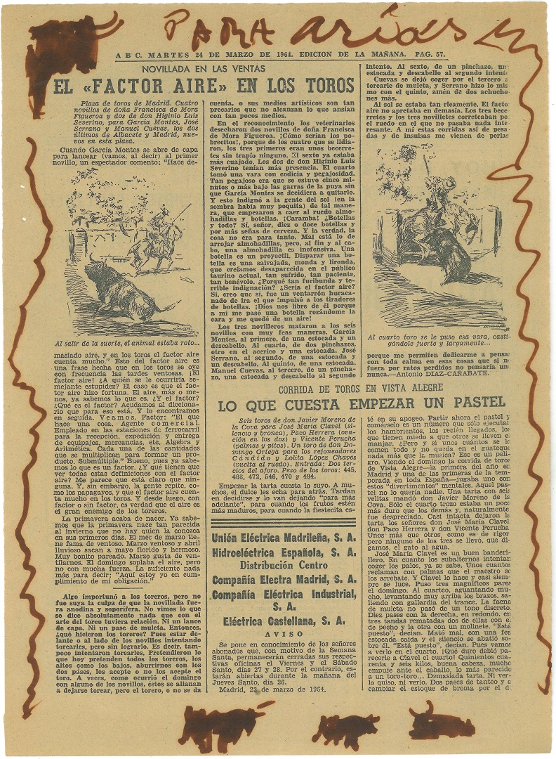 Ο Pablo Picasso γνωρίστηκε με τον Εουχένιο Άριας στο Βαλορί της Νότιας Γαλλίας όπου ο Άριας είχε διαφύγει ως αριστερός πολιτικός εξόριστος από το καθεστώς του Franco και εργαζόταν ως κουρέας. Λίγο μετά τον θάνατο του Εουχένιο Άριας το 2008, η οικογένειά του βρήκε μια δέσμη φύλλων από την ισπανική δεξιά και μοναρχική εφημερίδα ABC, στα οποία ο Picasso είχε παρέμβει με σχέδια και σημάδια στο περιθώριο των χρονικών των ταυρομαχιών, και με χειρόγραφο το επώνυμο «Arias», ως προσφώνηση προς τον παραλήπτη αυτής της ιδιαίτερης αλληλογραφίας. Πρόκειται για περισσότερα από 60 φύλλα, απόδειξη της φιλικής αλληλογραφίας μεταξύ δύο οπαδών της ταυρομαχίας, που έλαβε χώρα μεταξύ 1962 και 1968.