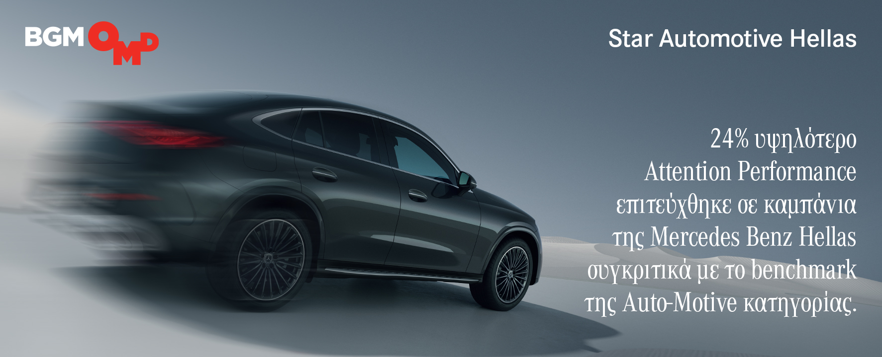Η BGM OMD σε αποκλειστική συνεργασία με την εταιρεία DoubleVerify (DV), υπολόγισε το ATTENTION Index των χρηστών για την καμπάνια GLC της Star Automotive Hellas, Γενικού Διανομέα της Mercedes-Benz στην Ελλάδα Η μέτρηση πραγματοποιήθηκε για πρώτη φορά στην Ελλάδα στον κλάδο της αυτοκινητοβιομηχανίας και έγινε με την χρήση του νέου Authentic Attention Measurement tool, της DoubleVerify, κορυφαίας εταιρείας λογισμικού που ειδικεύεται στον τομέα του Brand Safety και Viewability Μeasurement.