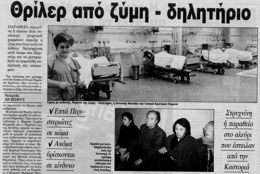 «Γύρω στις 4 το απόγευμα η 46χρονη Ειρηνή Κλιματσά και ο 24χρονος γιος της Αντώνης, άρχισαν να παραλύουν μέχρι που έπεσαν σε κώμα. Μεταφέρθηκαν εσπευσμένα στο Γενικό Κρατικό Νοσοκομείο Πειραιώς, όπου οι γιατροί τούς οδήγησαν στη Μονάδα Εντατικής Θεραπείας.