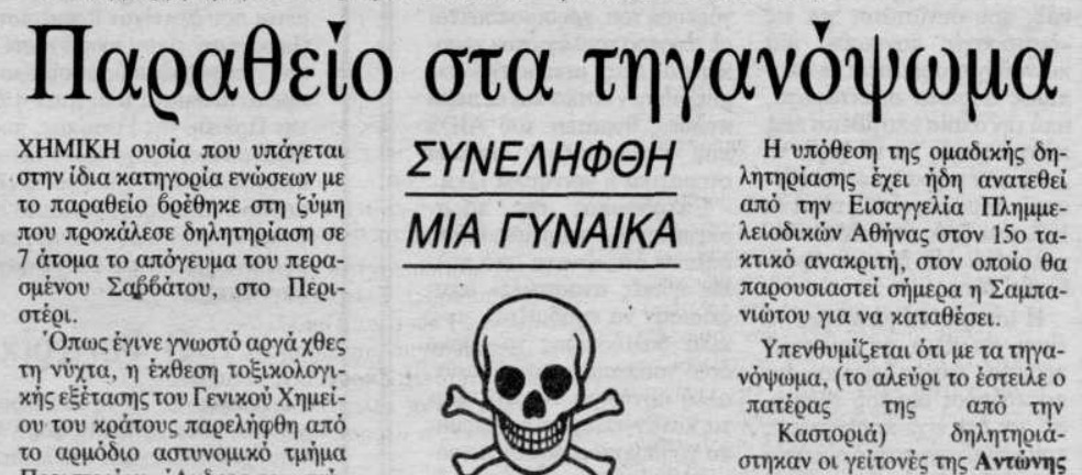 »Ο σύζυγος της Ειρήνης Κλιματσά που έπαθε κι αυτή όπως και ο γιος της δηλητηρίαση μας λέει: “Είχαμε φάει για μεσημέρι και ξαπλώσαμε να κοιμηθούμε. Γύρω στις 4.00 ήρθε ένας επισκέπτης. Ο γιος μου αισθάνθηκε αδιαθεσία. Μετά από λίγο τα ίδια συμπτώματα παρουσίασε και η γυναίκα μου”.