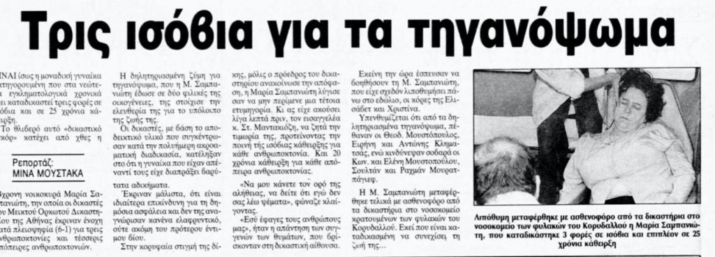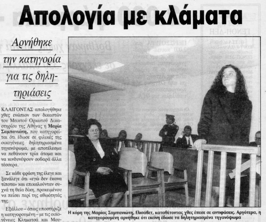 «Είναι ίσως η μοναδική γυναίκα κατηγορούμενη που στα νεώτερα εγκληματολογικά χρονικά έχει καταδικαστεί τρεις φορές σε ισόβια και σε 25 χρόνια κάθειρξη. (…) Οι δικαστές του Μεικτού Ορκωτού Δικαστηρίου της Αθήνας την έκριναν ένοχη κατά πλειοψηφία (6-1) για τρεις ανθρωποκτονίες και τέσσερις απόπειρες ανθρωποκτονιών.
