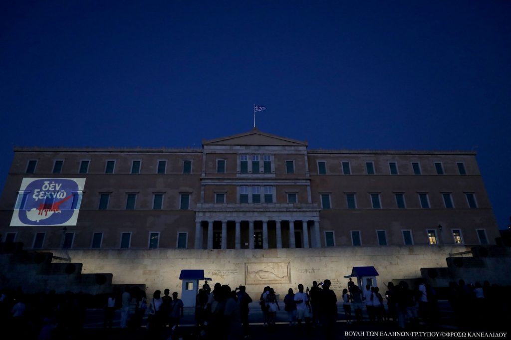 Με το εμβληματικό σήμα «ΔΕΝ ΞΕΧΝΩ» για την εισβολή του «Αττίλα» στην Κύπρο, το 1974, φωταγωγήθηκε το Μέγαρο της Βουλής των Ελλήνων, καθώς φέτος συμπληρώνονται 50 ολόκληρα χρόνια από την παράνομη τουρκική στρατιωτική εισβολή στη Μεγαλόνησο.