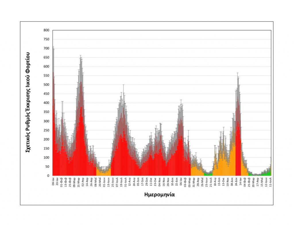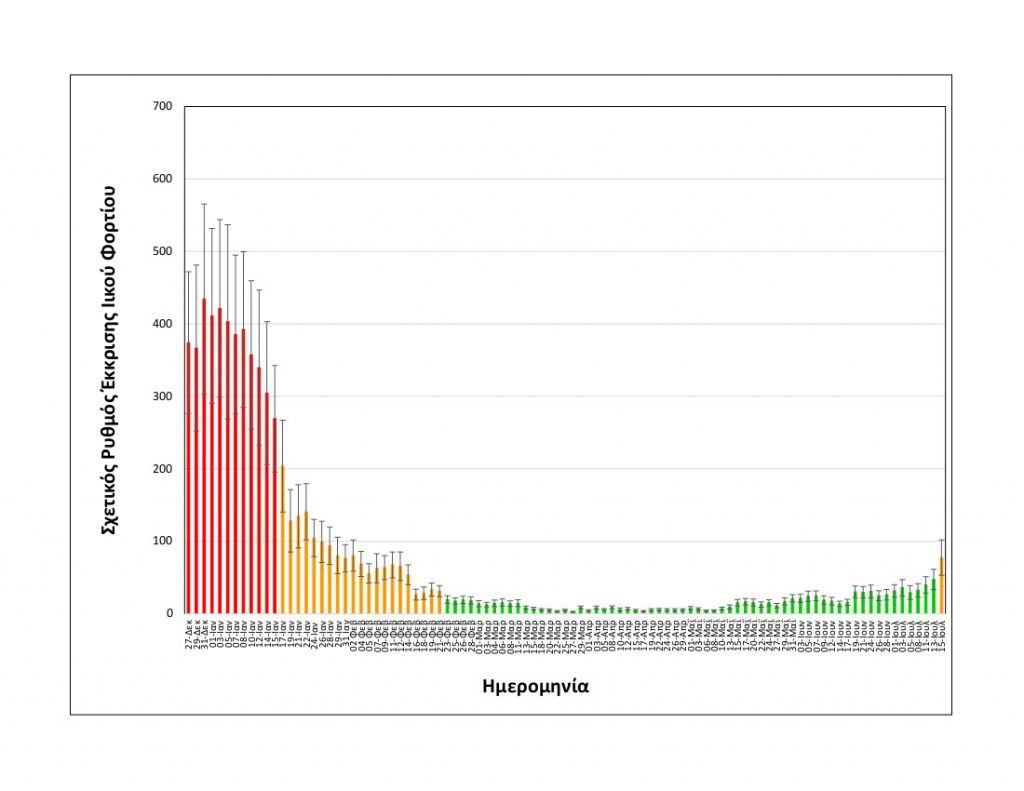 Με τον μέσο χρόνο που μεσολαβεί από τη μόλυνση ενός ατόμου μέχρι να μολύνει αυτό με τη σειρά του τα δευτερογενή κρούσματα να ανέρχεται σε 2,8 ημέρες, ο ενεργός ρυθμός αναπαραγωγής των κρουσμάτων εκτιμάται στο 1.115.