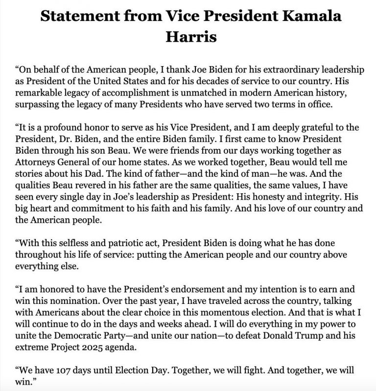 Είναι τιμή μου να έχω την υποστήριξη του προέδρου και πρόθεσή μου είναι να κερδίσω. Κατά τη διάρκεια του περασμένου έτους, ταξίδεψα σε όλη τη χώρα, μιλώντας με τους Αμερικανούς για την ξεκάθαρη επιλογή σε αυτές τις σημαντικές εκλογές. Και αυτό είναι που θα θα συνεχίσω να το κάνω τις επόμενες ημέρες και εβδομάδες. Θα κάνω ό,τι περνάει από το χέρι μου για να ενώσω τους Δημοκρατικούς -και να ενώσω το έθνος μας- για να νικήσω τον Ντόναλντ Τραμπ και την ακραία ατζέντα του. Έχουμε 107 ημέρες μέχρι την ημέρα των εκλογών. Μαζί, θα αγωνιστούμε. Και μαζί, θα νικήσουμε».