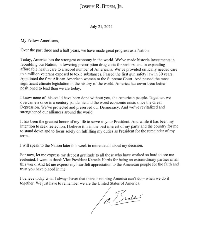 Ο Μπάιντεν, γνωστοποίησε την απόφασή του μέσω επιστολής που ανάρτησε ο ίδιος στα κοινωνικά δίκτυα: