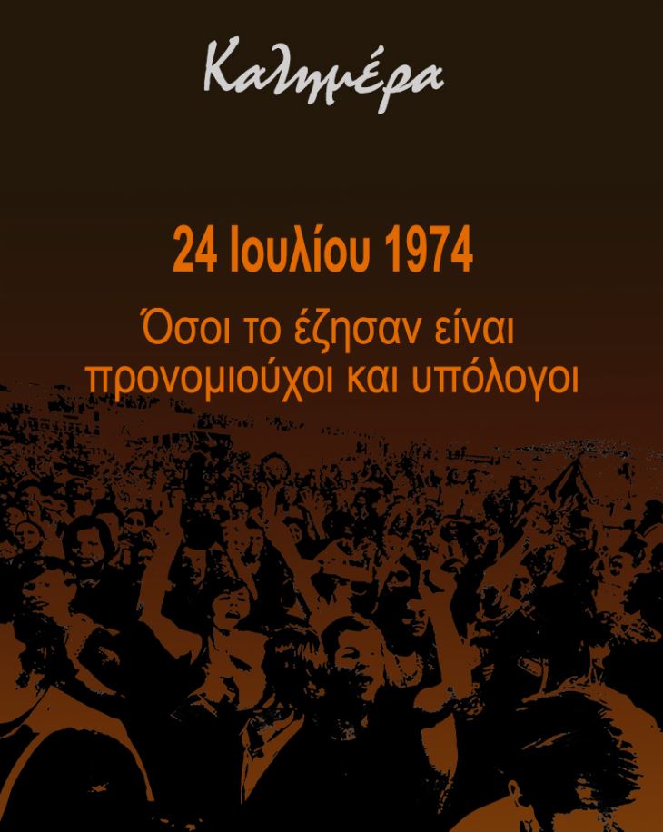 Ο σκιτσογράφος Αρκάς αναφέρεται με σαφήνεια στη συγκεκριμένη ημέρα αλλά η εικόνα που επιλέγει είναι μουντή,  σχεδόν μαύρη, ενώ το μήνυμα που τη συνοδεύει αιχμηρό καθώς χαρακτηρίζει όσους έζησαν τη Μεταπολίτευση «προνομιούχους» αλλά και «υπόλογους».