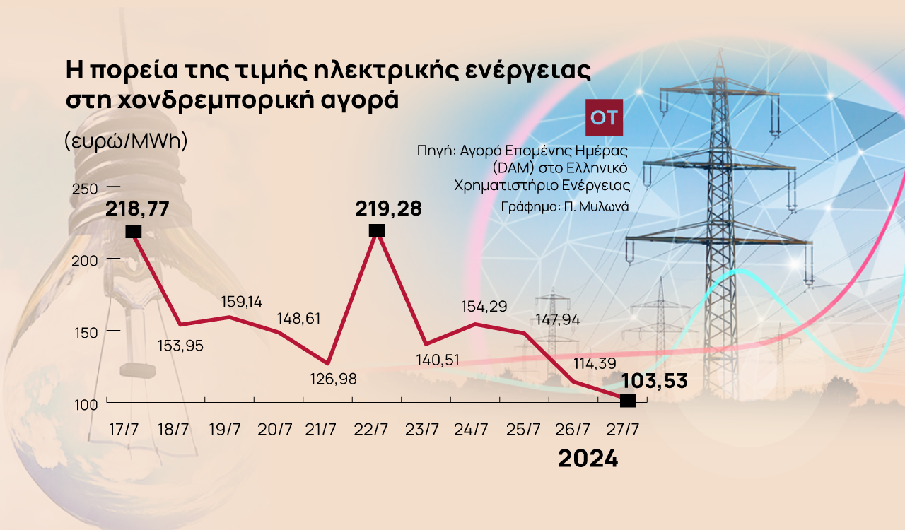 Από τα επίπεδα των 219,28 ευρώ/MWh στις 22 Ιουλίου η μέση τιμή της χονδρεμπορικής αγοράς ηλεκτρικής ενέργειας έχει βουτήξει στις 27 Ιουλίου 103,55 ευρώ/MWh.