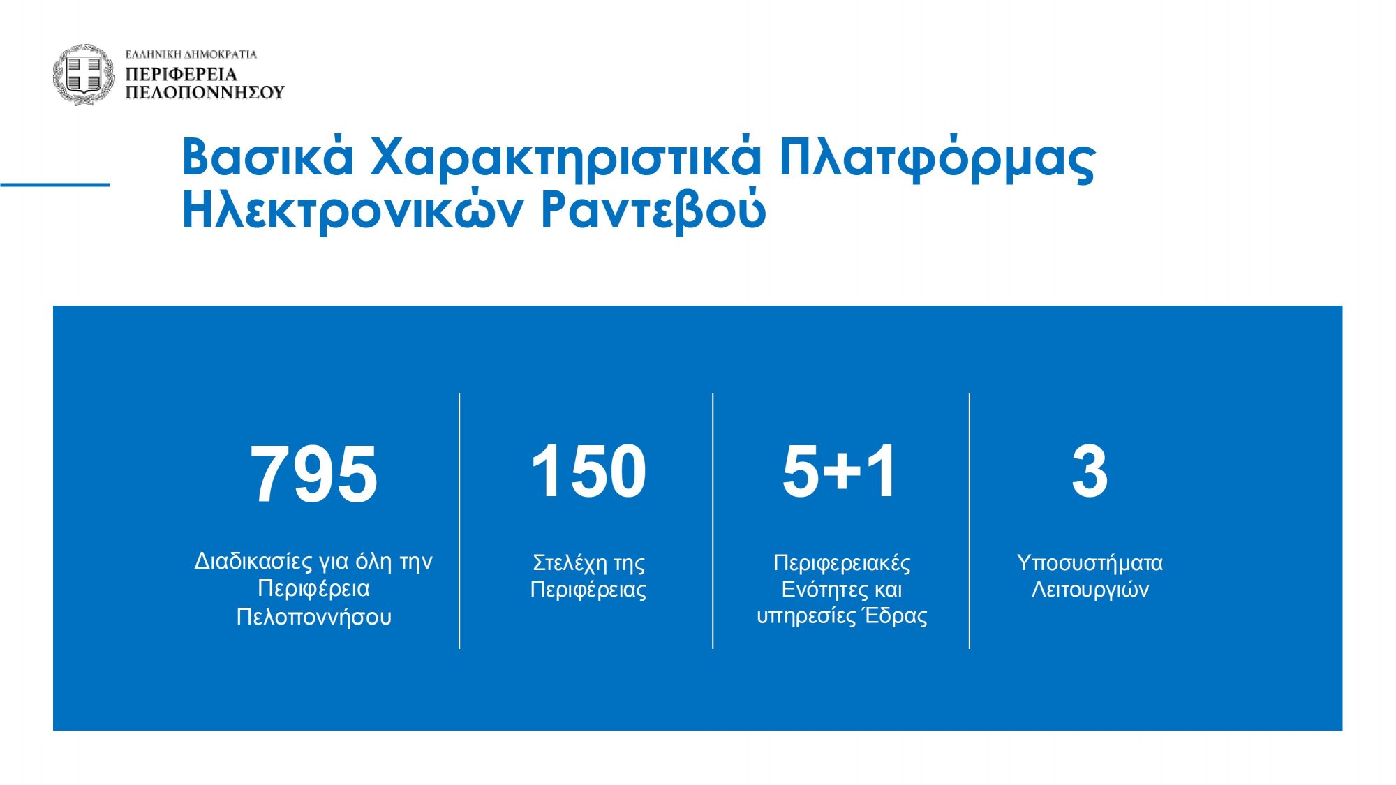 Ο Περιφερειάρχης Πελοποννήσου, Δημήτρης Πτωχός, ανέφερε: «Είναι μία σπουδαία ημέρα για εμάς καθώς είμαστε έτοιμοι να παρουσιάσουμε τα πρώτα αποτελέσματα της προσπάθειας που κάνουμε για την ψηφιακή μετάβαση στην Περιφέρεια Πελοποννήσου». Ο Αντιπεριφερειάρχης Ψηφιακής Διακυβέρνησης, Περικλής Νικολακέας, παρουσίασε την πλατφόρμα Διαχείρισης Ιατρικών Ειδικοτήτων, επισημαίνοντας τα οφέλη της νέας ψηφιακής πραγματικότητας.