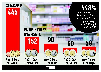 Ενδεικτικά, σύμφωνα με τα στοιχεία του Πανελλήνιου Φαρμακευτικού Συλλόγου, με βάση τη λίστα που δημοσίευσε ο ΕΟΦ, σε 445 σκευάσματα η αύξηση θα είναι από 1 έως 99 λεπτά, σε 152 από 1 έως 1,99 ευρώ, σε 90 από 2 έως 2,99 ευρώ, σε 50 σκευάσματα από 3 έως 3,99 ευρώ και σε 59 σκευάσματα από 4 έως 4,99 ευρώ. Η πιο ακραία αύξηση είναι της τάξης των 448% και παρατηρείται σε ένα σκεύασμα του οποίου η λιανική τιμή σήμερα είναι 0,96 και, σύμφωνα με την προτεινόμενη λιανική τιμή, θα κοστίζει 5,26 ευρώ. Να σημειωθεί ότι οι νέες τιμές αναμένεται να ισχύσουν από το φθινόπωρο.