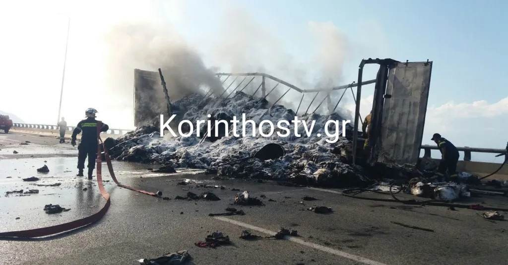 Νταλίκα πήρε φωτιά εν κινήσει στο 160χλμ στον αυτοκινητόδρομο Κορίνθου – Πατρών, στον κόμβο Διακοπτού, στο ρεύμα προς Πάτρα, το απόγευμα της Δευτέρας.
