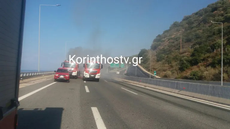 Επι τόπου έσπευσαν κι επιχειρούν στην κατάσβεση 3 οχήματα της Πυροσβεστικής, περιπολικά του Τμήματος Τροχαίας Αυτοκινητόδρομου και οχήματα της Ολυμπίας οδού.