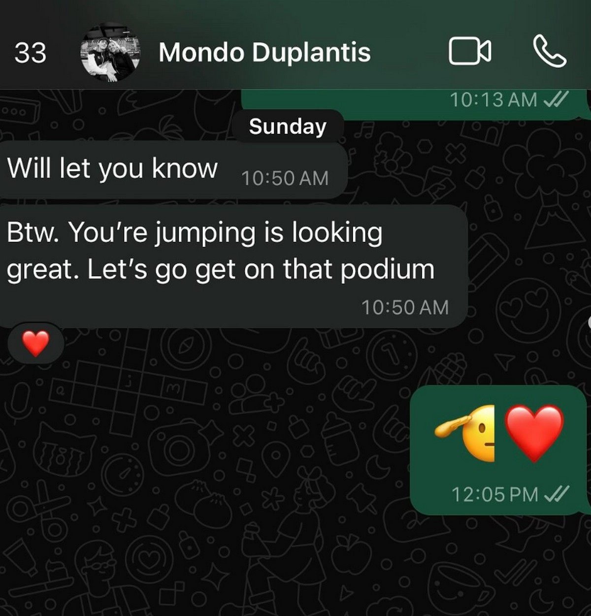 Σε αυτήν ο Μόντο Ντουπλάντις αναφέρεται στα εξαιρετικά άλματα του Καραλή στον προκριματικό και τον προτρέπει να ανέβει στο πόντιουμ στον τελικό. Έτσι και έγινε με τους δυο τους να κατακτούν το χρυσό και το χάλκινο μετάλλιο.