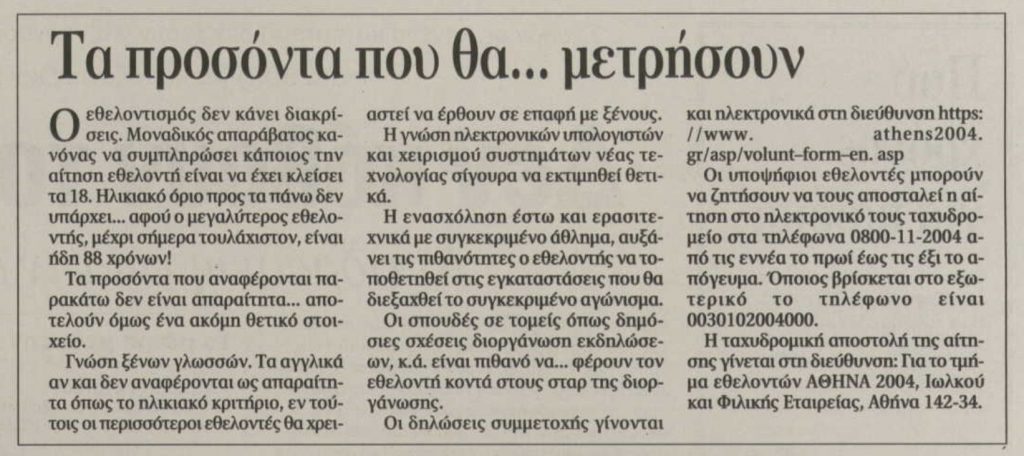 Eθελοντισμός είναι μια πράξη κοινωνικού χαρακτήρα, που γίνεται χωρίς ατομικό κέρδος και προς το συμφέρον του κοινωνικού συνόλου. Το βέβαιο όμως είναι ότι από τον εθελοντισμό στους Ολυμπιακούς Αγώνες του 2004 κέρδισα πολλά περισσότερα απ’ όσα έδωσα.