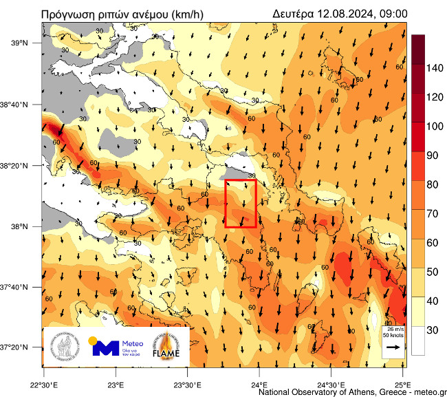 «Σχετικά με τη δασική πυρκαγιά που βρίσκεται σε εξέλιξη στην ευρύτερη περιοχή της βορειοανατολικής Αττικής, η επόμενη ομάδα χαρτών παρουσιάζει την πρόγνωση για τις ριπές του ανέμου στην Αττική από το πρωί (09:00) της Δευτέρας 12 Αυγούστου έως το απόγευμα (18:00) της ίδιας ημέρας. Όπως χαρακτηριστικά φαίνεται, από το πρωί (09:00) έως και το απόγευμα (18:00) Δευτέρας 12 Αυγούστου, στην ευρύτερη περιοχή της πυρκαγιάς (σημειώνεται με το κόκκινο πλαίσιο στους χάρτες) αναμένονται ριπές ανέμου που θα ξεπερνούν τα 70 – 80 km/h. Σταδιακή εξασθένιση των ανέμων (και των ριπών) αναμένεται από τις 18:00 – 19:00 (θα υπάρξει νεότερη ενημέρωση)».