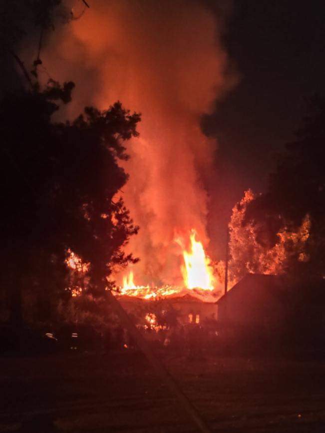 Στο σημείο έσπευσαν άμεσα 12 πυροσβέστες με 5 πυροσβεστικά οχήματα και ανέλαβαν δράση για να εμποδίσουν την επέκταση της φωτιάς στα δεκάδες δέντρα που περιστοιχίζουν το φλεγόμενο κτήριο.