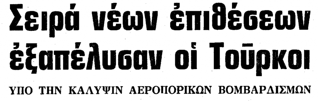 »Ο ανταποκριτής προσθέτει ότι αδιάκοπα κύματα τουρκικών πολεμικών αεροσκαφών πλήττουν από της πρωΐας διά βομβών, ρουκετών και πολυβόλων τας ελληνοκυπριακάς περιοχάς της Λευκωσίας.